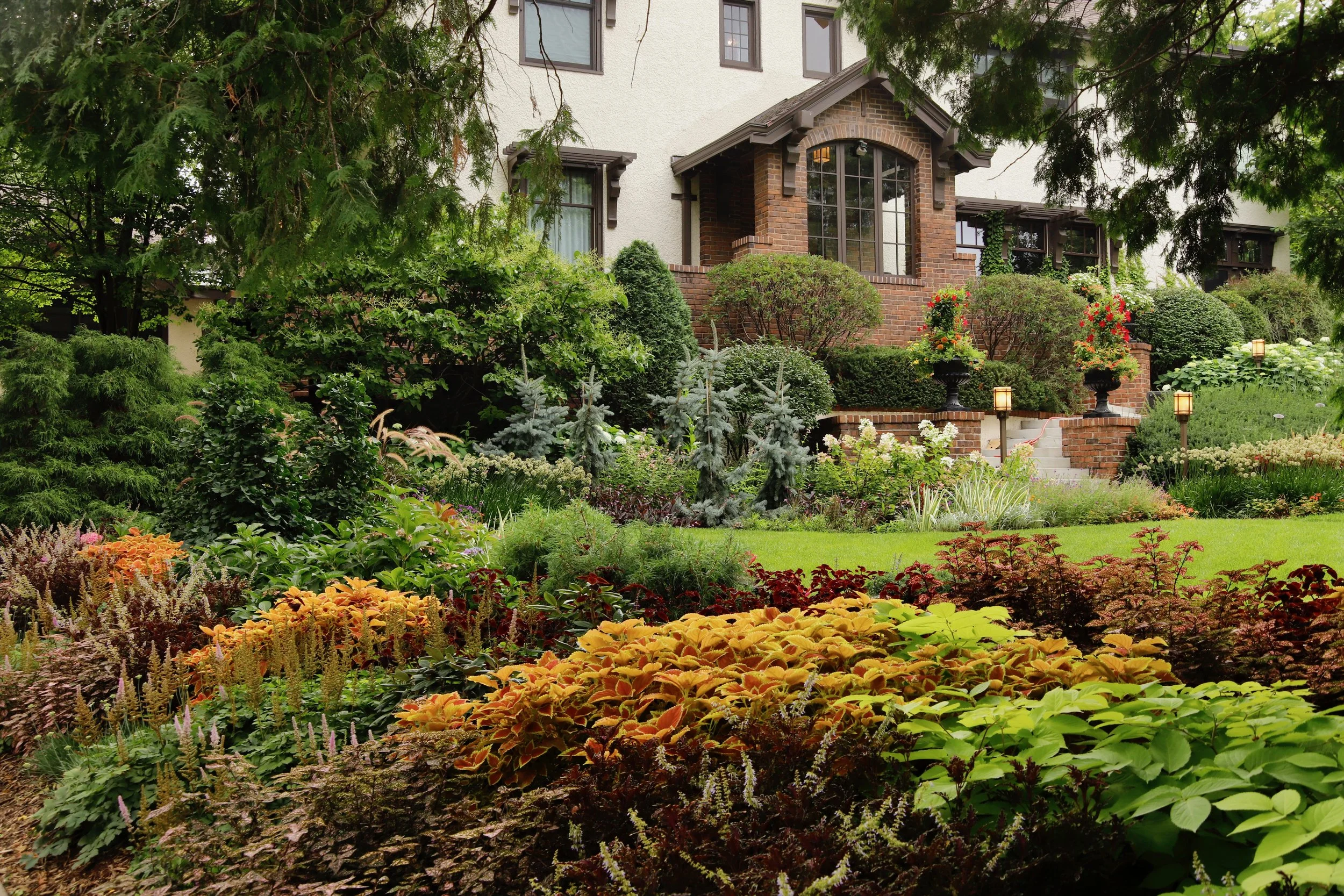 The Curry/Mulcahy garden unfolds before you, a cohesive whole, but with a diverse mix of plants and dedicated spaces for playing, relaxing, and entertaining. Each area has a focal point with unique pops of visual interest that bring a fresh perspective as you move around the property. Throughout the garden are mature elements that are respectful of the stately home, intertwined with unique perennial combinations of textures and colors, as well as plants for pollinators and wildlife, edible plants, and the bright highlights of annual leaves and blooms. The family moved to the house in 2017 and, since 2020, Tangletown Gardens has worked with Cate and Tim to develop and nurture the landscape. The space has evolved from a mostly green yard to a diverse mix of textures, colors, and dimensionality. The design utilizes a wide range of trees, shrubs, perennials and annuals, which create calm, welcoming spaces for humans, bees, butterflies, and birds. It is easy to enjoy watching the gardens evolve from season to season and year to year. Cate and Tim celebrate the consistency of color and interest over the life of the garden, noting that something is always growing, blooming, or bearing fruit. Cate is not afraid to push the boundaries of traditional plant selections, experimenting with marginal varieties that are becoming hardier in Minnesota as our climate warms. Tim takes pride in tending to the fruits and vegetables and being able to use them in home-cooked meals. The garden has been a wise teacher, and Cate notes that spending time in her garden has shown her the beauty of nature and its interconnectedness, that nature grounds us even in an urban environment, and that even small, simple changes can transform spaces.